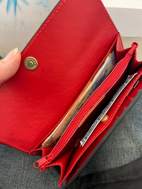 100% lederen damesportemonnaie met een rood afgewerkte binnenkant. 3 afzonderlijke compartimenten met 2 drukknoppen. Biedt plaats aan tenminste 8 kaarten . Verkrijgbaar in zwart , donkerblauw, taupe , camel, bordeaux, oranje , chocolade bruin en khaki .